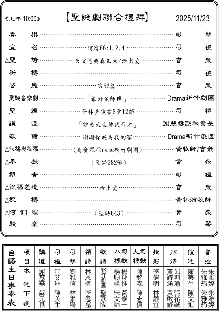 - 本主日(11/23)舉行新竹drama劇團年度戲劇「最好的師傅」首演差遣禮拜,聯合禮拜時間/上午10:00,講道:謝慧燕副秘書長,歡迎闔家蒞臨。