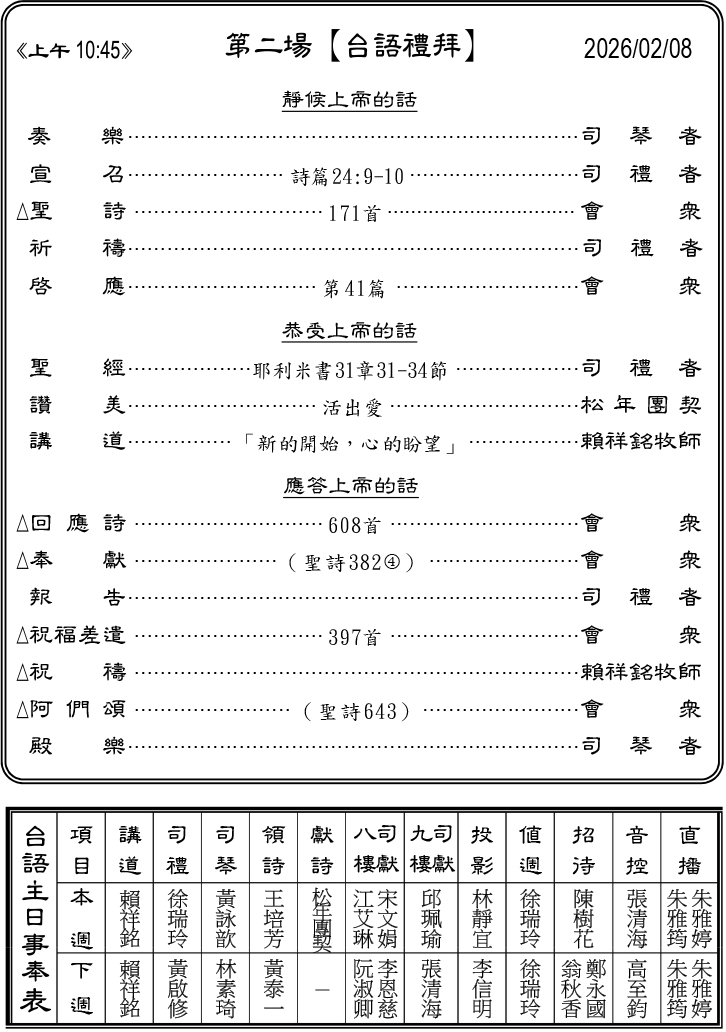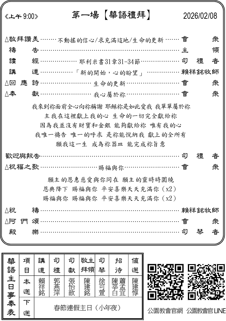 下週主日2月15日聯合禮拜預告上午10:00 ※小年夜
