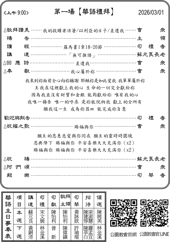 - 禮拜組本主日(3/1)中午12:00於8樓舉辦「台語禮拜領詩同工訓練會」,敬邀領詩同工禮拜後留步參加。