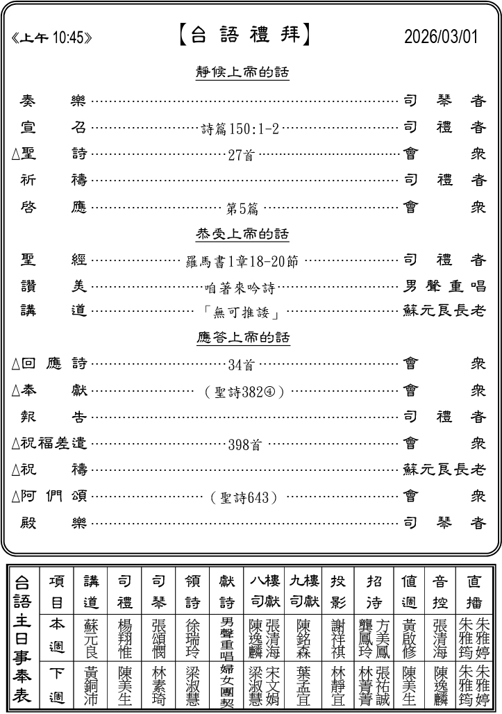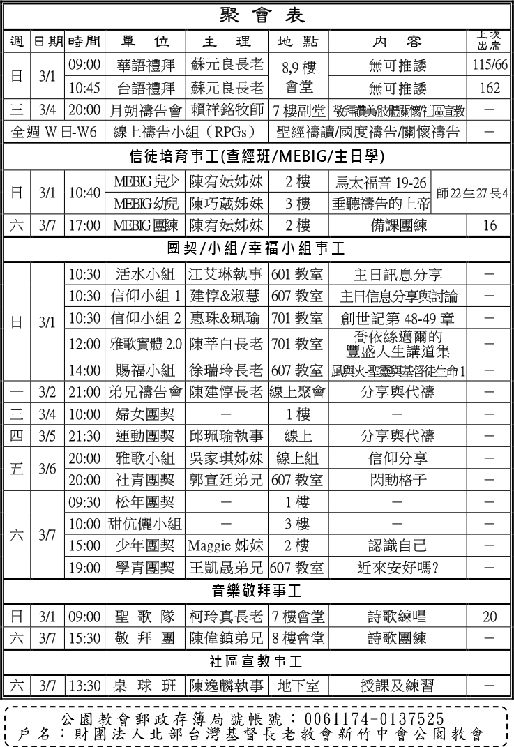 - 禮拜組本主日(3/1)中午12:00於8樓舉辦「台語禮拜領詩同工訓練會」,敬邀領詩同工禮拜後留步參加。