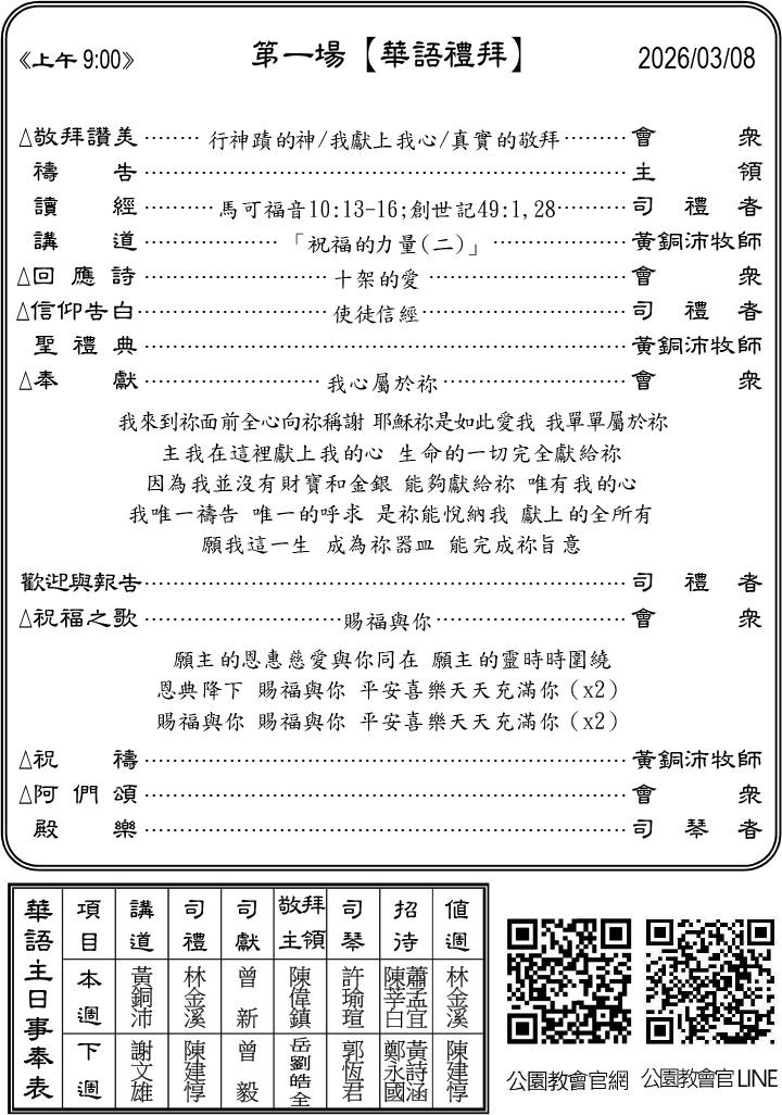 1. 婚訊:曾誠執事與周恩萱姊妹本週六(3/14)上午9:30於公園教會舉行結