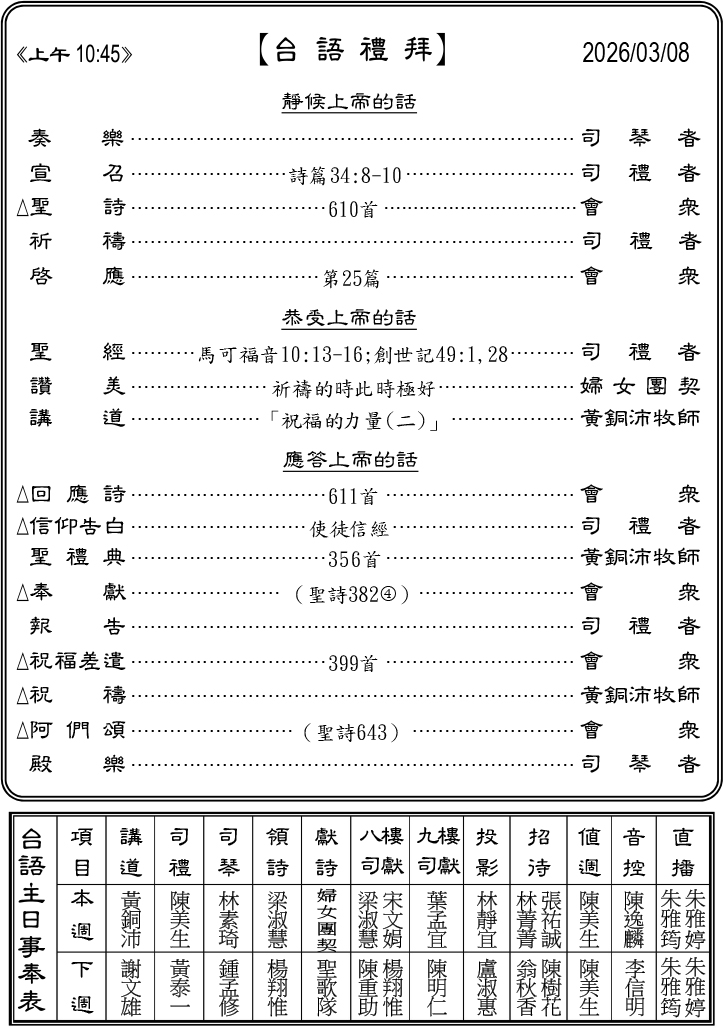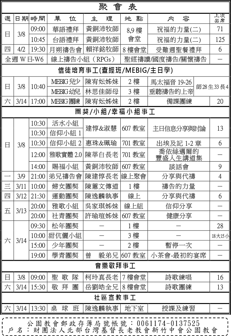 1. 本主日(3/8)為婦女事工主日,感謝婦女團契於台語禮拜中獻詩。