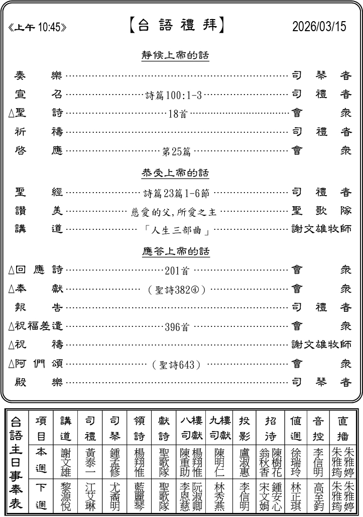 下週主日兩堂禮拜預告(3月22日)