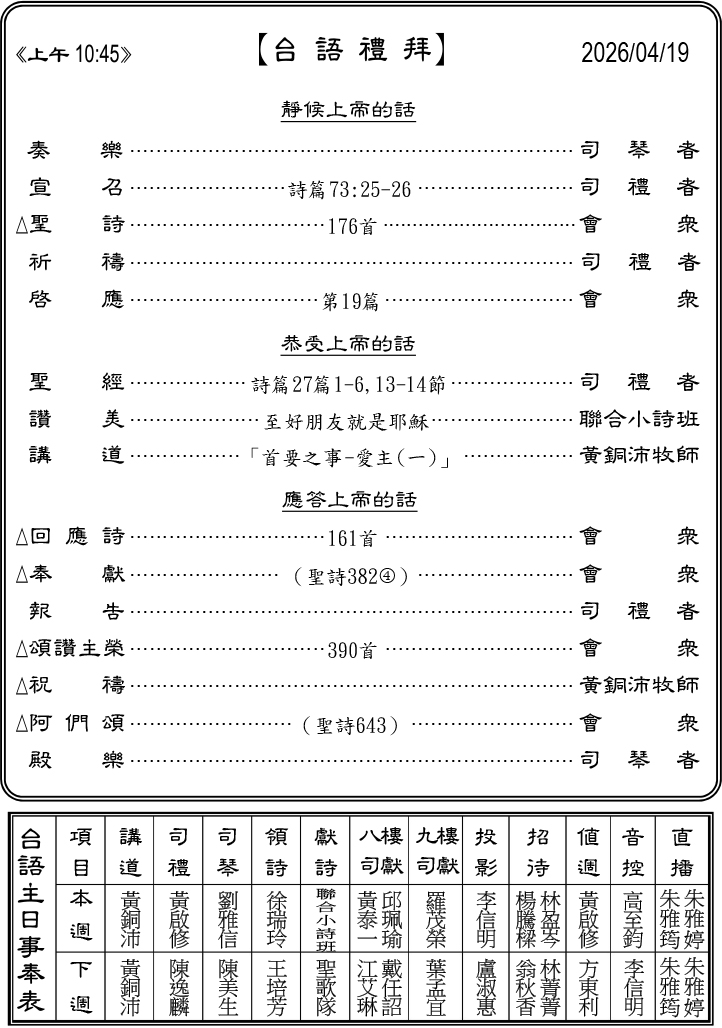 啟應=第28篇 宣召=詩篇63:3-5 聖詩=379,159,401